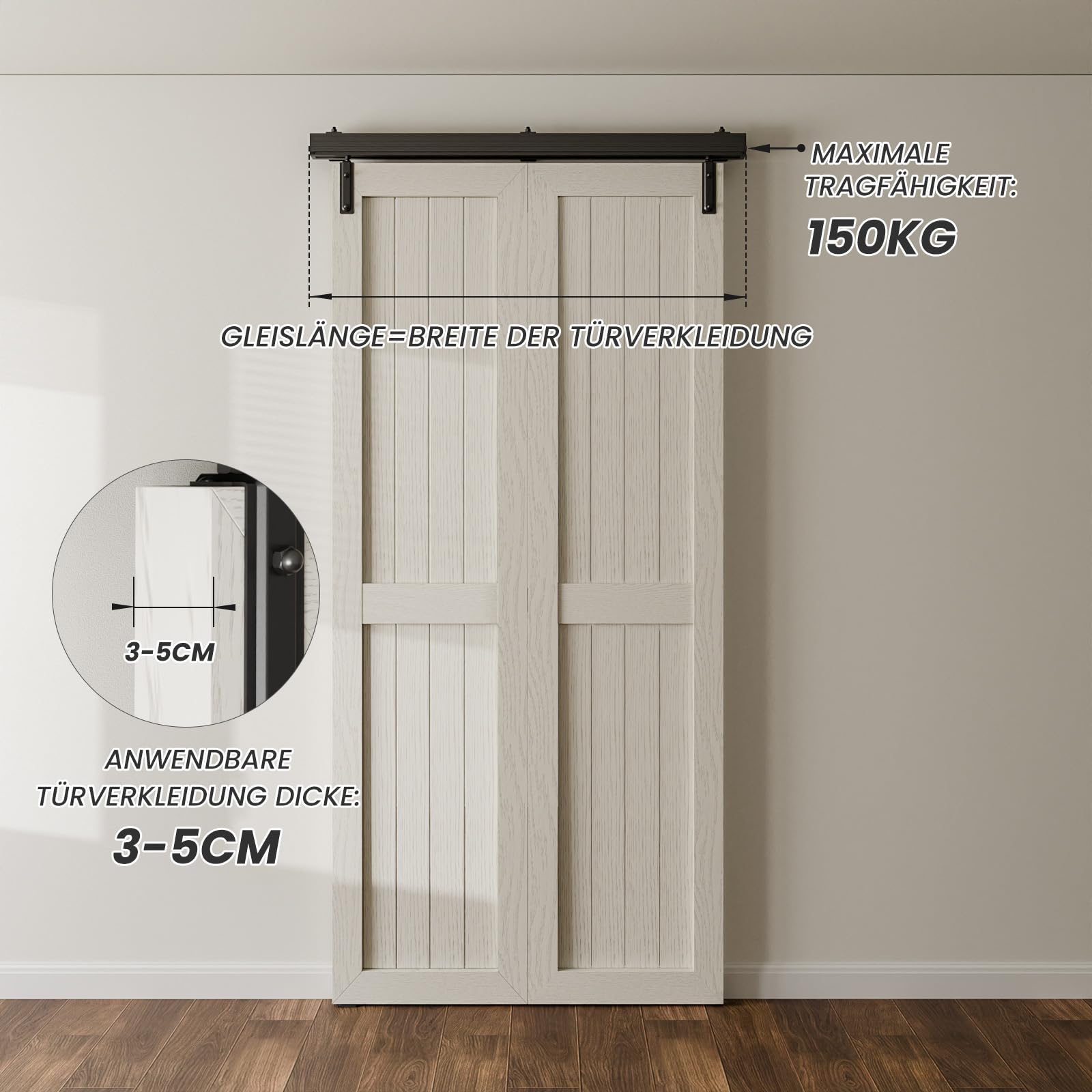 Das Hardware-Kit für Schiebetüren besteht aus strapazierfähigem Baustahl und gleitet reibungslos. Die maximale Belastbarkeit beträgt 150 kg pro Tür