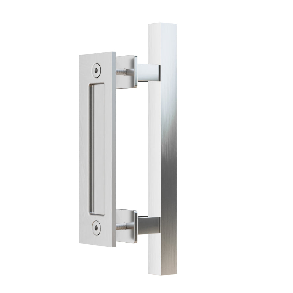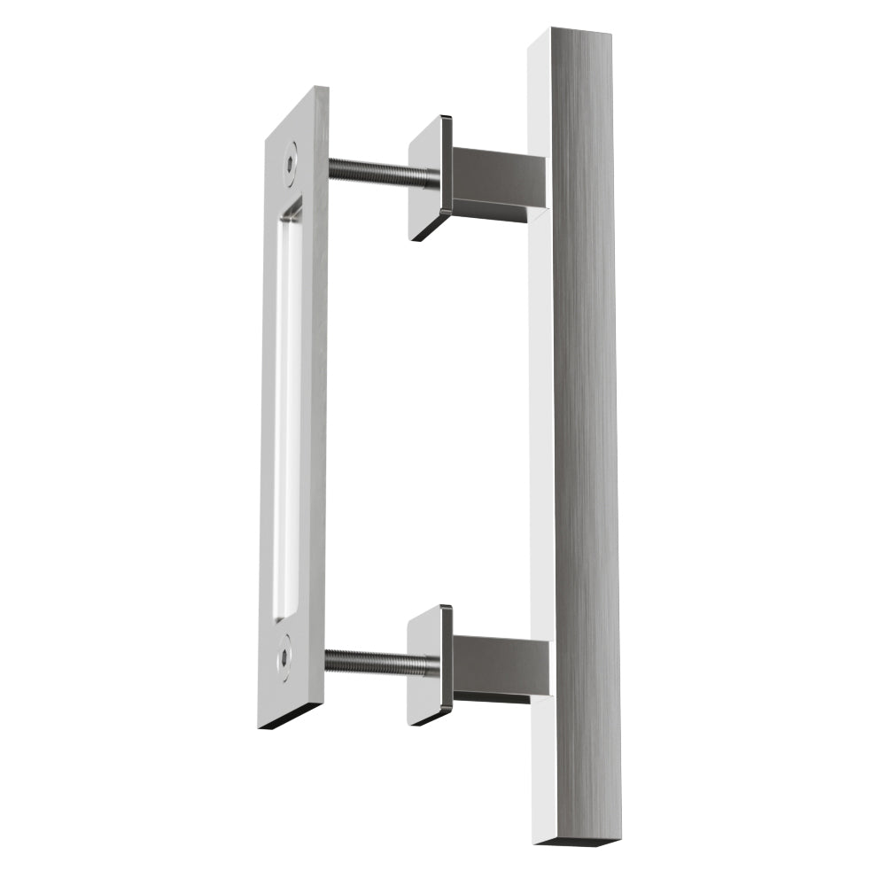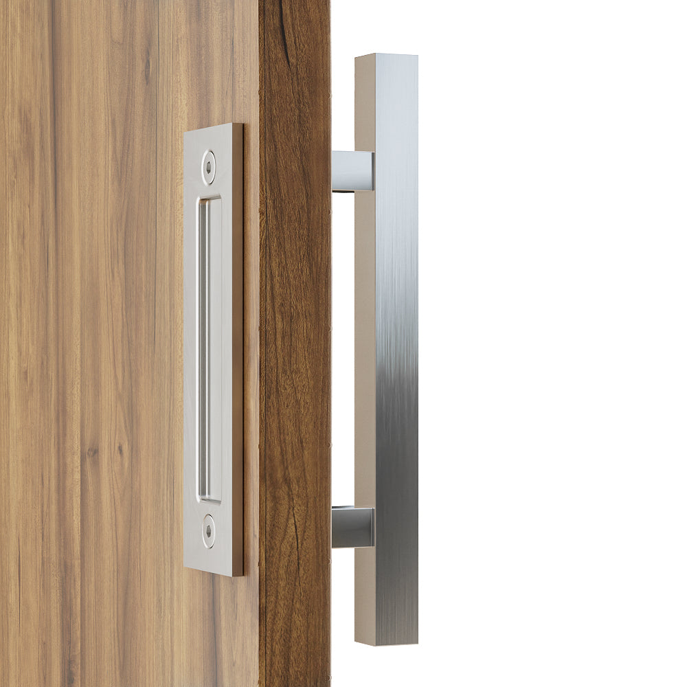 Doppelseitiger Türgriff, mit einer bündigen Rückwand auf der Innenseite und einem Griff auf der Außenseite. Die Rückwand ist so konzipiert, dass sie einseitig bündig ist, ohne dass die Türverkleidung geschlitzt werden muss.
