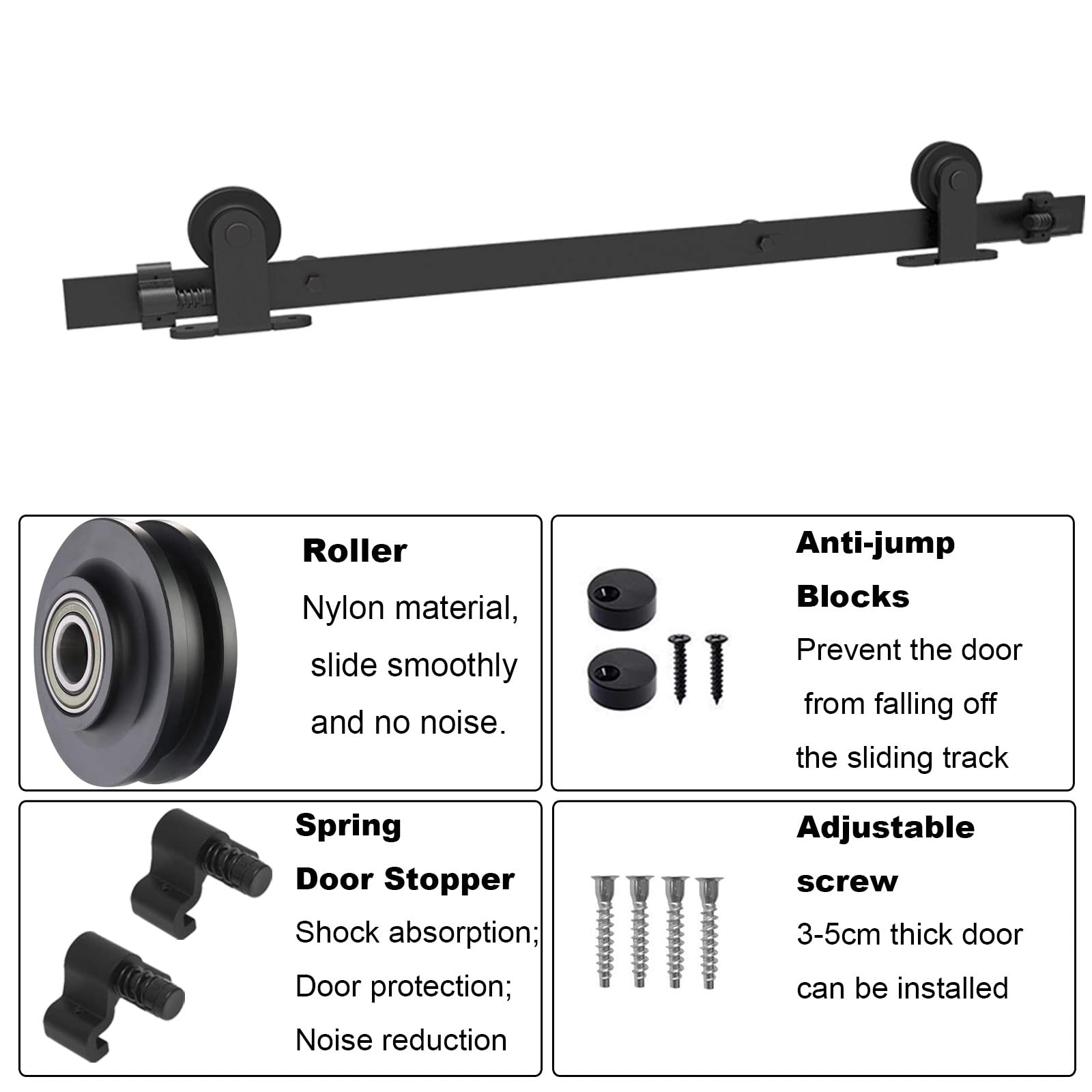- Right Choice to Your Door: This barn door hardware kit fits 3-4.8cm thickness door; Door weight capacity: 100kg. With integrated spring door stops reducing the vibration for quiet closing
